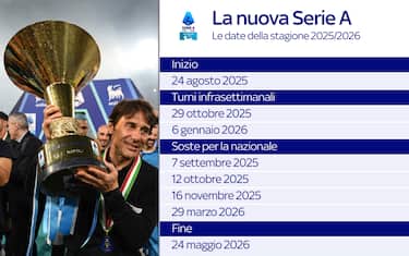 La nuova Serie A prenderà il via nel weekend del 23-24 agosto 2025 e si concluderà con la 38° giornata in programma nel weekend del 23-24 maggio 2026. Saranno 4 le soste per le nazionali (7 settembre 2025, 12 ottobre 2025, 16 novembre 2025, 29 marzo 2026) e invece sono stati previsti soltanto due turni infrasettimanali (9^ giornata-mercoledì 29 ottobre 2025 e 19^ giornata-martedì 6 gennaio 2016).