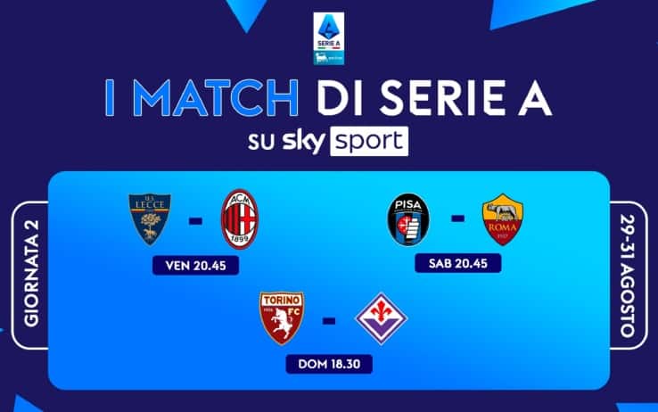 Il secondo turno di Serie A, prima della pausa per le nazionali, si gioca da venerdì 29 a domenica 31 agosto. Le 3 partite in diretta su Sky e in streaming su NOW saranno: Lecce-Milan, Pisa-Roma e Torino-Fiorentina. La giornata di campionato si apre venerdì 29 agosto alle 18.30 con Cremonese-Sassuolo e prosegue alle 20.45 con Lecce-Milan, in diretta su Sky Sport Calcio, Sky Sport 4K, Sky Sport 251 e in streaming su NOW. Sabato doppio appuntamento alle 18.30 con Parma-Atalanta e Bologna-Como, mentre alle 20.45 è il momento di Pisa-Roma, in diretta su Sky Sport Calcio, Sky Sport 4K, Sky Sport 251 e Napoli-Cagliari. Sono quattro gli appuntamenti della domenica con, alle 18.30, Genoa-Juventus e Torino-Fiorentina, in diretta su Sky Sport Calcio, Sky Sport 251 e in streaming su NOW. Doppio appuntamento anche alle 20.45 con Inter-Udinese e Lazio-Verona. Si chiude così la giornata di campionato in vista della pausa per le nazionali.