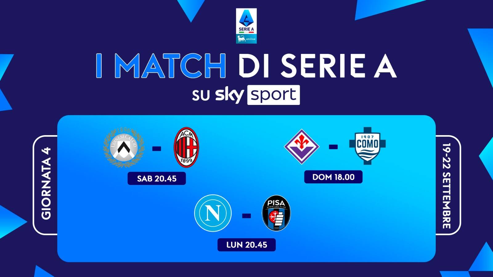 guida tvLa 4^ giornata di Serie A si gioca da venerdì 19 a lunedì 22 settembre, alle 20.45, con Napoli-Pisa, in diretta su Sky - canali Sky Sport Calcio, Sky Sport UNO, Sky Sport 4K, Sky Sport 251 - e in streaming su NOW. Le partite della quarta giornata di campionato: dove vederle, gli arbitri e i giocatori squalificati