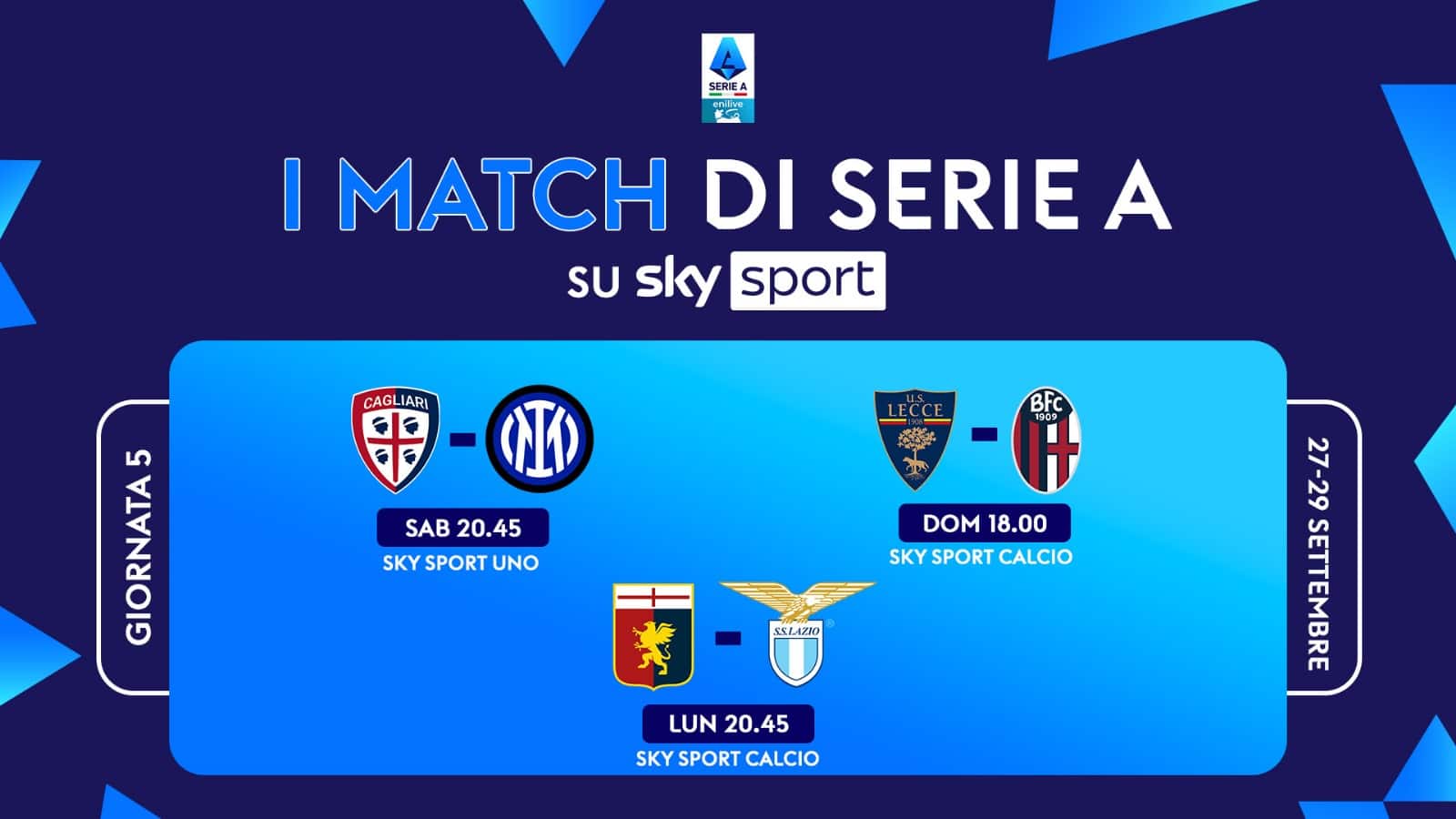 Il quinto turno di Serie A si gioca da sabato 27 a lunedì 29 settembre. Le 3 partite in diretta su Sky e in streaming su NOW saranno: Cagliari-Inter, Lecce-Bologna e Genoa-Lazio. La giornata di campionato si apre sabato alle 15.00 con Como-Cremonese e prosegue alle 18.00 con Juventus-Atalanta e alle 20.45 Cagliari-Inter in diretta su Sky Sport Calcio, Sky Sport Uno, Sky Sport 4K, Sky Sport 251 e in streaming su NOW. Sono cinque gli appuntamenti della domenica. Si inizia alle 12.30 con Sassuolo-Udinese segue il doppio appuntamento delle 15.00 con Roma-Verona e Pisa-Fiorentina. Alle 18.00 è il momento Lecce-Bologna, in diretta su Sky Sport Calcio, Sky Sport 251 e in streaming su NOW. Chiude la domenica Milan-Napoli. Due i posticipi di lunedì 29 settembre: alle 18.00 Parma-Torino e alle 20.45, Genoa-Lazio su Sky Sport Calcio, Sky Sport 4K, Sky Sport 251 e in streaming su NOW.