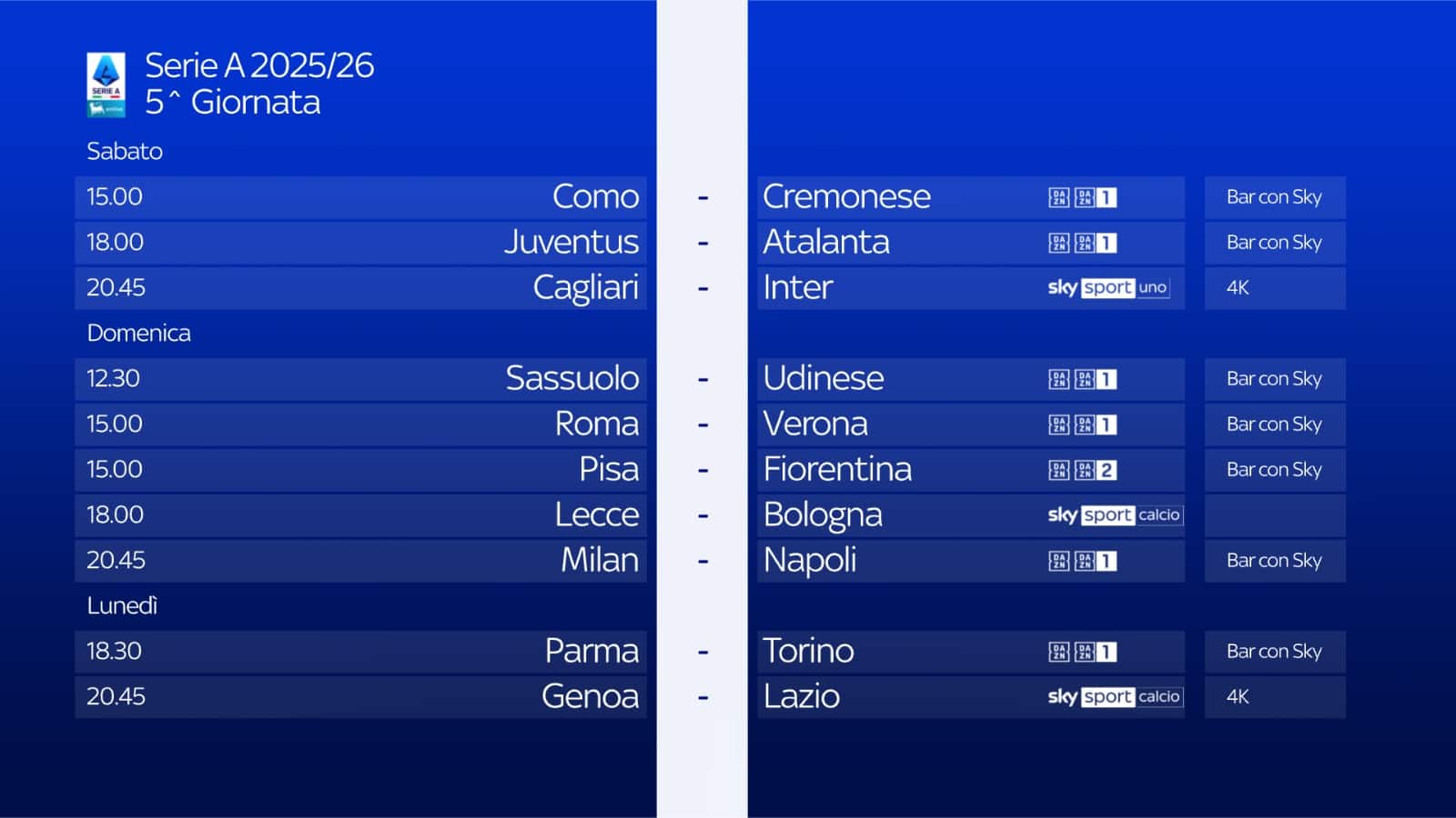 Il calendario di Serie A, le partite e gli orari della 5^ giornata