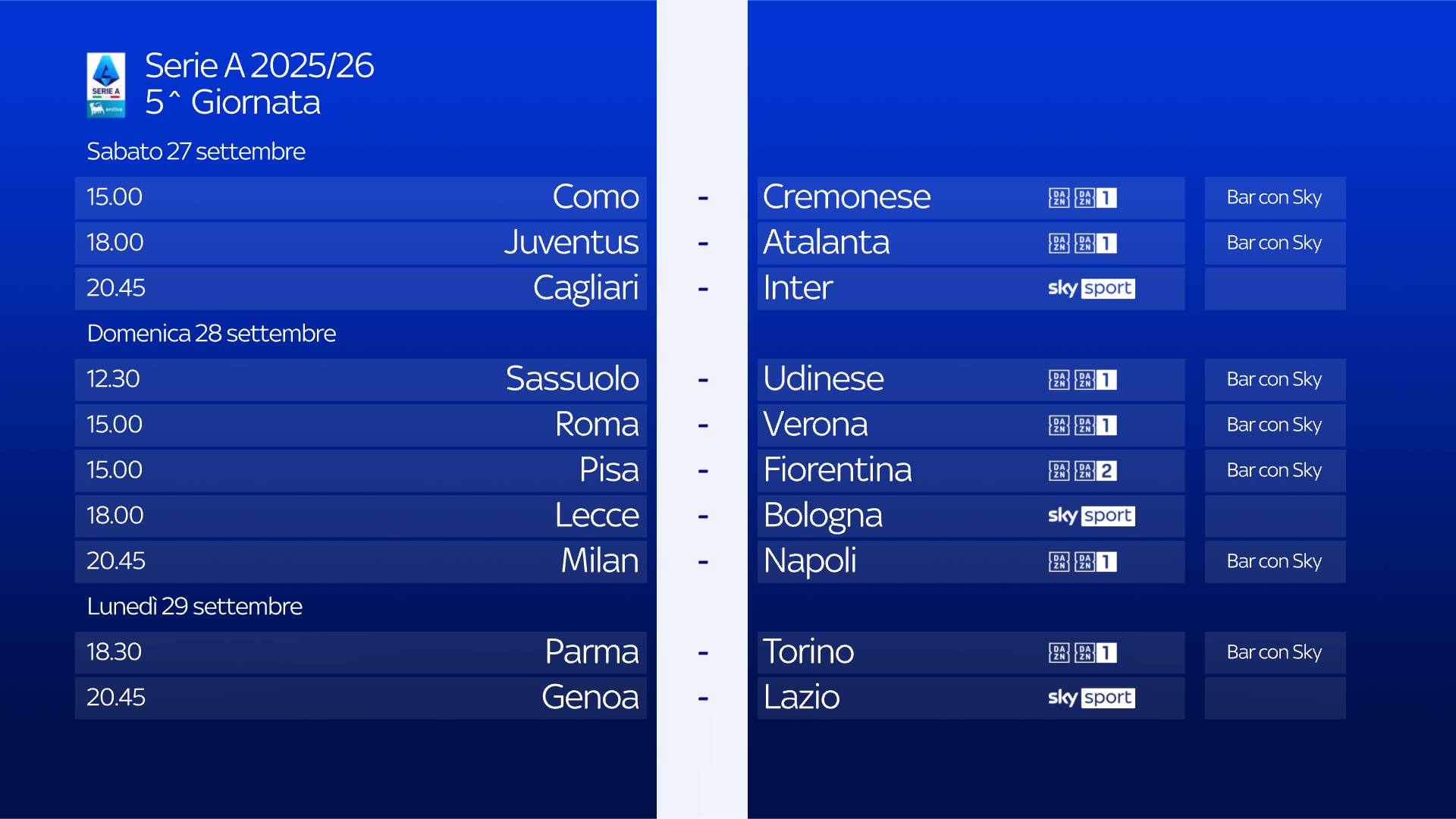 Le 10 partite di ogni turno di Serie A sono visibili anche in tutti i locali con abbonamento Sky, scopri il più vicino su sky.it/trovabar.