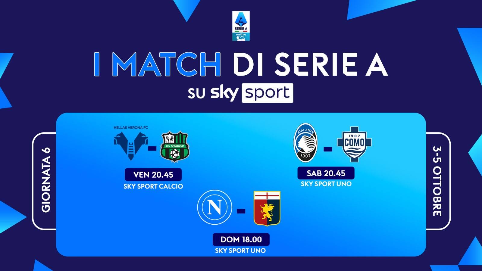 Il sesto turno di Serie A della stagione si gioca da venerdì 3 a domenica 5 ottobre. Le 3 partite in diretta su Sky e in streaming su NOW saranno: Verona-Sassuolo, Atalanta-Como e Napoli-Genoa. La giornata di campionato si apre venerdì alle 20.45 con Verona-Sassuolo, in diretta su Sky Sport Calcio, Sky Sport 251 e in streaming su NOW. Sabato doppio appuntamento alle 15.00 con Lazio-Torino e Parma-Lecce. Si prosegue alle 18.00 con Inter-Cremonese e alle 20.45 Atalanta-Como su Sky Sport Calcio, Sky Sport UNO, Sky Sport 4K, Sky Sport 251 e in streaming su NOW. Sono cinque gli appuntamenti della domenica che si apre alle 12.30 con Udinese-Cagliari segue il doppio appuntamento delle 15.00 con Fiorentina-Roma e Verona-Pisa. Alle 18.00 è il momento di Napoli-Genoa su Sky Sport Calcio, Sky Sport UNO, Sky Sport 4K, Sky Sport 251 e in streaming su NOW. La giornata di campionato si chiude domenica sera, alle 20.45, con Juventus-Milan.