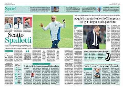 - “La Juve a Lucio”: anche il Corsport apre con l’ex allenatore di Roma, Inter e Napoli, candidato a prendersi ora la panchina della Juve, non tralasciando però Mancini come alternativa. Il quotidiano riporta anche le parole di Buffon, che ha lavorato con Spalletti in Nazionale: secondo l'ex portiere, Luciano è la soluzione ideale per la Juve