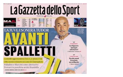 - “Avanti Spalletti”: dopo l’esonero di Tudor, così titola la Gazzetta che riferisce del possibile incontro previsto oggi tra Comolli e l’ex Ct della Nazionale. Due gli editoriali: “La Signora mangia allenatori” sui tanti cambi in panchina degli ultimi tempi bianconeri, poi Marco Iaria fa i conti del club, con un miliardo 'bruciato' in otto anni
