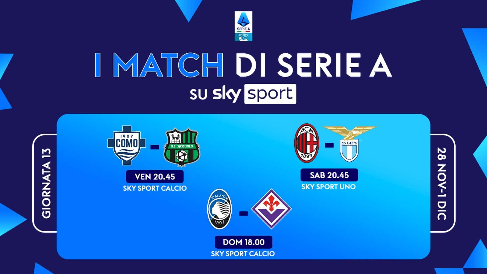 Il tredicesimo turno di Serie A della stagione si gioca da venerdì 28 novembre a lunedì 1^ dicembre. Le 3 partite in diretta su Sky e in streaming su NOW saranno: Como-Sassuolo, Milan-Lazio e Atalanta-Fiorentina. La giornata di campionato si apre venerdì sera con l’anticipo delle 20.45, su Sky Sport Calcio, Sky Sport 251 e in streaming su NOW. Sabato doppio appuntamento alle 15.00 con Genoa-Verona e Parma-Udinese. Si prosegue alle 18.00 con Juventus-Cagliari. La sera, alle 20.45, è il momento di Milan-Lazio, in diretta su Sky Sport Calcio, Sky Sport Uno, Sky Sport 4K, Sky Sport 251 e in streaming su NOW. Sono quattro gli appuntamenti della domenica. Si inizia alle 12.30 con Lecce-Torino per poi proseguire alle 15.00 con Pisa-Inter e alle 18.00 Atalanta-Fiorentina su Sky Sport Calcio, Sky Sport 4K, Sky Sport 251 e in streaming su NOW. La domenica si conclude alle 20.45 con, Roma-Napoli. La giornata di campionato si conclude lunedì 1^ dicembre, alle 20.45, con Bologna-Cremonese.