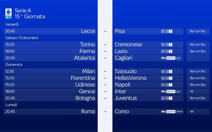 La domenica della 15^ giornata di campionato inizia alle 12.30 con Milan-Sassuolo per poi proseguire alle 15.00 con un doppio appuntamento: Cagliari-Roma e Udinese-Napoli. La giornata prosegue alle 18.00 con Genoa-Inter su Sky Sport Calcio, Sky Sport Uno, Sky Sport 4K, Sky Sport 251 e in streaming su NOW. Telecronaca di Maurizio Compagnoni con il commento di Riccardo Montolivo; inviati Matteo Barzaghi e Andrea Paventi. La sera alle 20.45 con, Bologna-Juventus.