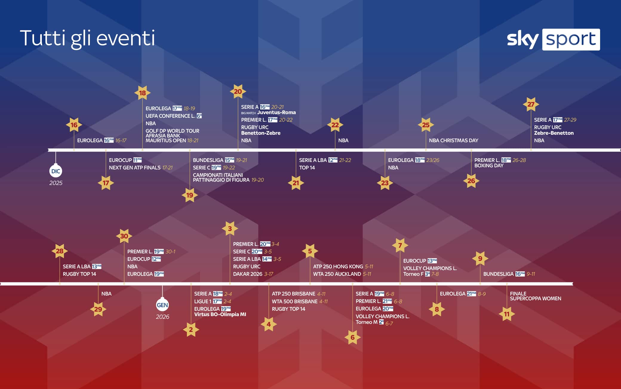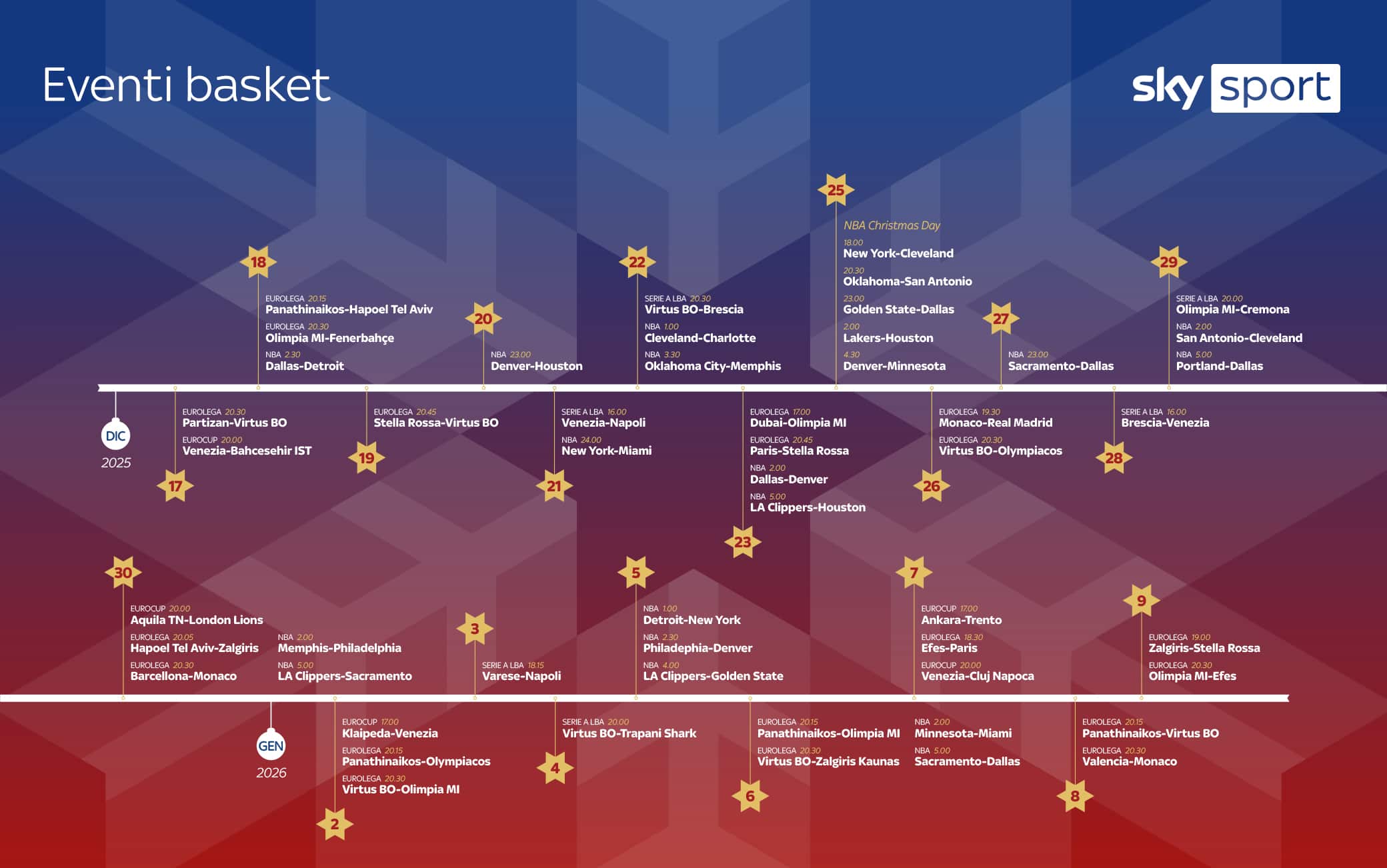 Sky Casa dello Sport, ma anche Casa del Basket, soprattutto a Natale: per l’intero periodo delle feste si scenderà in campo praticamente tutti i giorni per un totale di oltre 50 match tra Eurolega ed Eurocup in esclusiva, Serie A LBA e gli appuntamenti NBA, compreso l’attesissimo Xmas Day del giorno di Natale. Non mancheranno il tennis, che chiuderà un altro anno straordinario con le Next Gen ATP Finals a Jeddah da oggi al 21 dicembre, e i motori con una novità: Sky sarà official broadcaster della Dakar 2026, al via il 3 gennaio. E ancora, gli appuntamenti con rugby, golf, volley e tanto altro. Sarà dunque un periodo di feste ricchissimo per il basket italiano, europeo e americano, con oltre 50 appuntamenti da vivere nella grande arena di riferimento chiamata Sky Sport Basket. Il 21 e il 22 dicembre saranno di scena due match della 12^di Serie A Unipol: Reyer Venezia-Napoli Basket alle 16 e Virtus Bologna-Germani Brescia alle 20.30. Il weekend del 28 dicembre, invece, spazio alla 13esima giornata, con Germani Brescia-Reyer Venezia (27 dicembre alle 16) e Olimpia Milano-Vanoli Cremona (28 dicembre alle 20); il 14° turno che apre il nuovo anno vedrà sfidarsi Varese-Napoli Basket (3 gennaio alle 18.15) e Virtus Bologna-Trapani Shark (4 gennaio alle 20). Festività natalizie all’insegna anche dell’Eurolega in esclusiva, con Virtus Bologna e Olimpia Milano impegnate nelle grandi sfide internazionali della regular season già dal 17 dicembre, per un totale di cinque turni fino al 6 gennaio. Virtus in campo contro Partizan (17 dicembre alle 20.30), Stella Rossa (19 dicembre alle 20.45), Olympiacos (26 dicembre alle 20.30), Zalgiris Kaunas (6 gennaio alle 20.30) e Panathinaikos (8 gennaio alle 20.15). Le sfide dell’Olimpia: Fenerbahçe (18 dicembre alle 20.30), Dubai (23 dicembre alle 17), Panathinaikos (6 gennaio alle 20.30), Efes (9 gennaio alle 20.30). Appuntamento clou il 2 gennaio alle 20.30 con il derby italiano tra Virtus Bologna e Olimpia Milano. Non si ferma neanche l’Eurocup in esclusiva, con Trento e Venezia alla ricerca di un pass per il playoff. In programma tre turni: l’11° (16, 17 dicembre), il 12° (23, 30 dicembre, 2 gennaio), il 13° (6, 7 gennaio).