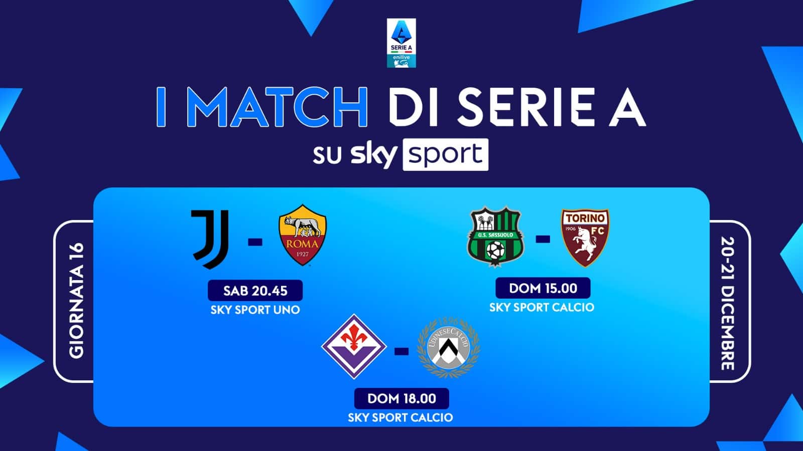 Il sedicesimo turno di Serie A della stagione si gioca in due fasi, una prima da sabato a domenica 21 dicembre e una seconda il 14 e 15 gennaio. Le 3 partite in diretta su Sky e in streaming su NOW saranno: Juventus-Roma, Sassuolo-Torino e Fiorentina-Udinese. La giornata di campionato si apre sabato alle 18.00 con Lazio-Cremonese. La sera, alle 20.45, il Big Match Juventus-Roma su Sky Sport Calcio, Sky Sport Uno, Sky Sport 4K, Sky Sport 251 e in streaming su NOW. La domenica si inizia alle 12.30 con Cagliari-Pisa mentre alle 15.00 con Sassuolo-Torino su Sky Sport Calcio, Sky Sport 251 e in streaming su NOW. La giornata prosegue alle 18.00 con Fiorentina-Udinese su Sky Sport Calcio, Sky Sport 4K, Sky Sport 251 e in streaming su NOW. La sera alle 20.45 si conclude la prima parte della giornata di campionato con Genoa-Atalanta.