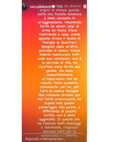 Questo il messaggio social di Pisacane, che ha spiegato l'accaduto e tranquillizzato sulle condizioni del fratello. "Come riportato da diversi organi di stampa, questa notte mio fratello Gianluca è stato coinvolto in un'aggressione, rimanendo ferito da alcuni colpi d'arma da fuoco. Stava rientrando a casa, aveva appena chiuso il locale di famiglia ai Quartieri Spagnoli dopo un'altra giornata di lavoro - ha scritto l'allenatore del Cagliari su Instagram -. Volevo intanto rassicurare tutti sulle sue condizioni: non è in pericolo di vita, ha riportato delle ferite alla gamba, sta bene compatibilmente all'esperienza che ha vissuto. Tanto spavento, ovviamente: per lui, per tutta la nostra famiglia. Non volevano dirmelo per non farmi preoccupare. In queste ore ho ricevuto tanti messaggi e telefonate, ringrazio davvero tutti per la solidarietà e l'affetto".