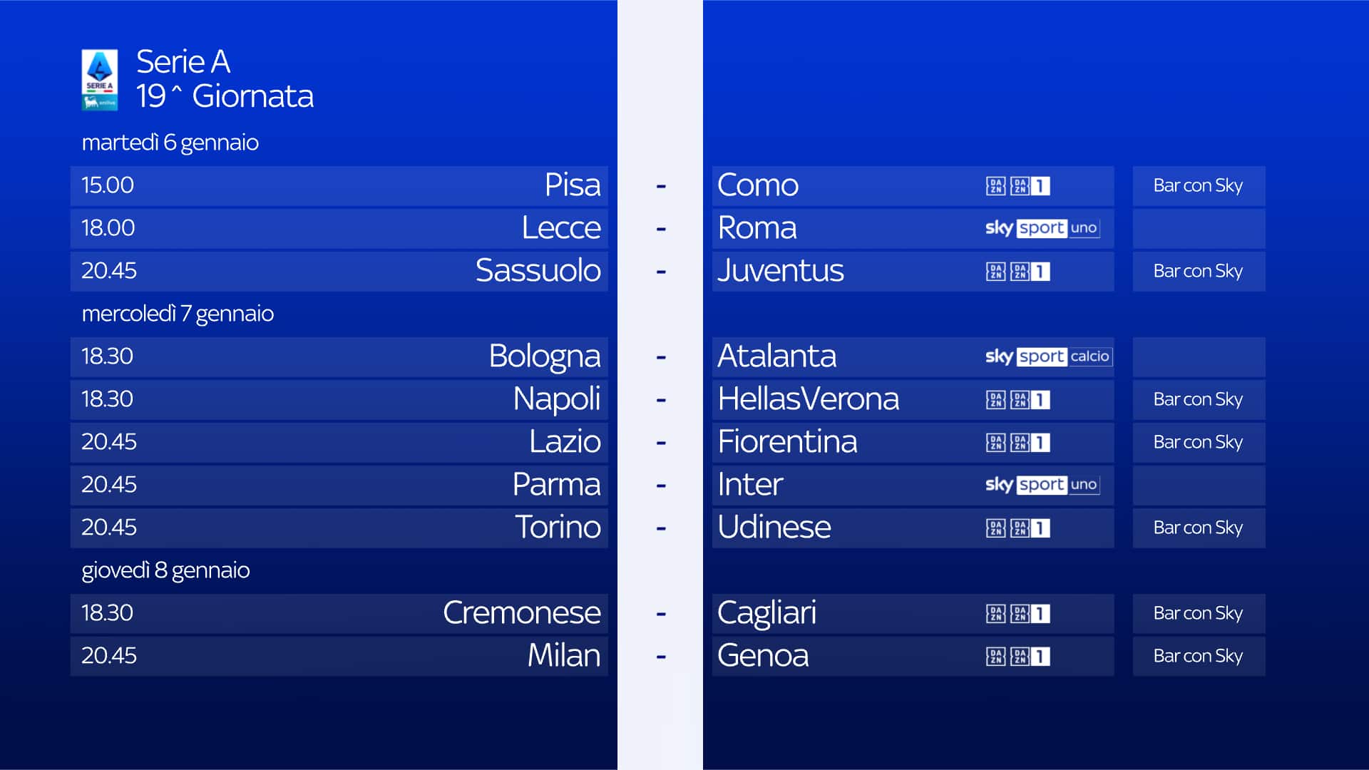 guida tvOggi, giovedì 8 gennaio, si chiude la 19^ giornata di Serie A. Tutti gli appuntamenti del giovedì di campionato