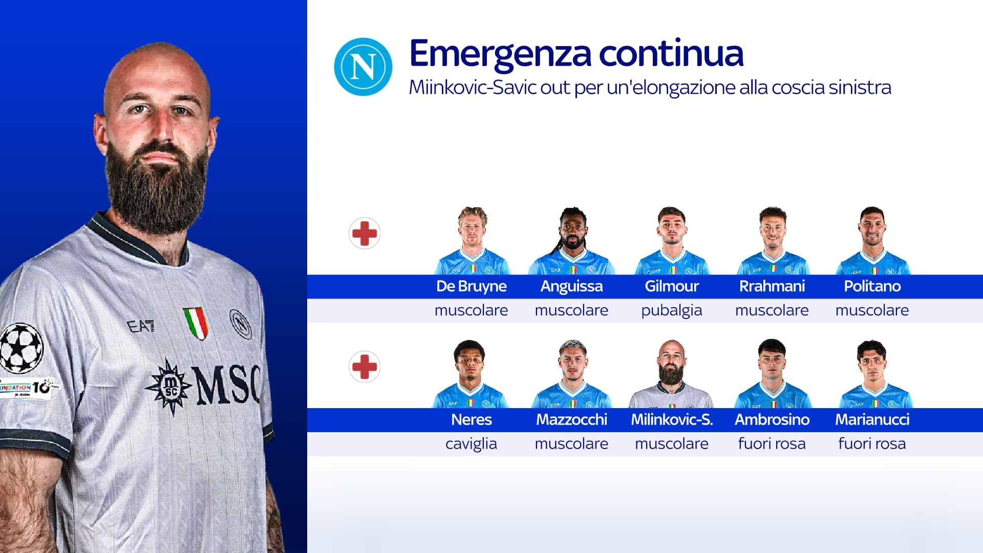 Di Neres e Milinkovic-Savic abbiamo detto, ma la lista degli indisponibili è davvero lunga. A partire dai lungodegenti De Bruyne, Anguissa (doveva tornare con la Juve ma è stato frenato dal mal di schiena) e Gilmour. A questi si sono aggiunti di recente anche Rrahmani, Politano e Mazzocchi. Un'emergenza senza fine per Antonio Conte, mentre la vetta della classifica occupata dall'Inter è ora lontana 9 punti e alle porte c'è una delicata sfida in Champions League col Chelsea da dentro o fuori.