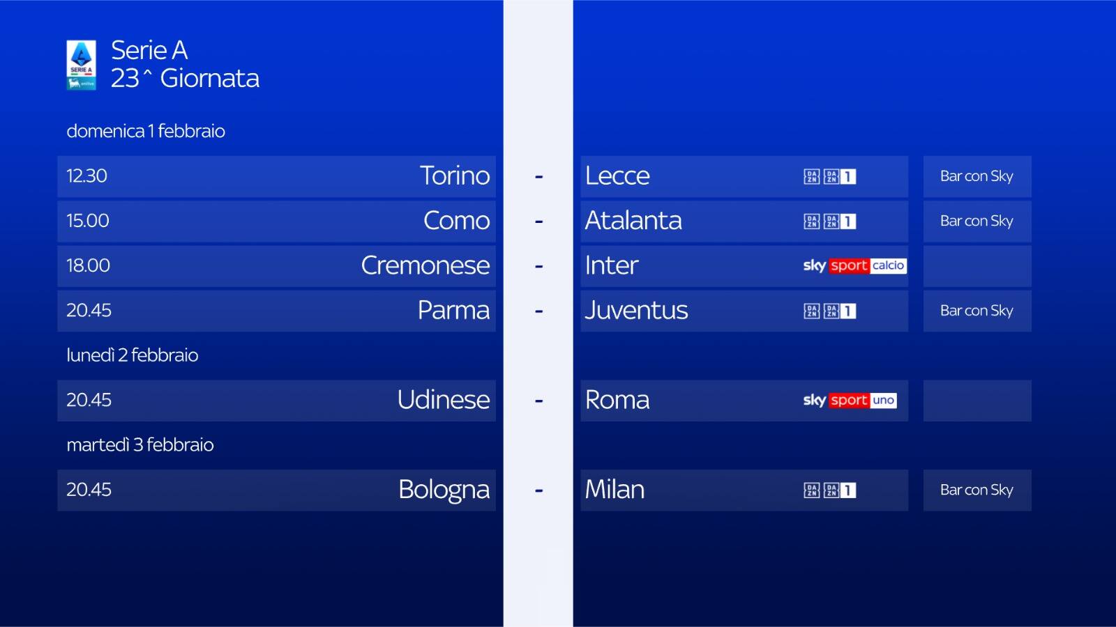 GUIDA TVLa partita Udinese-Roma della 23^ giornata di Serie A, si gioca lunedì 2 febbraio alle ore 20.45 e sarà in diretta su Sky Sport Calcio, Sky Sport Uno, Sky Sport 4K, Sky Sport 251 e in streaming su NOW. Ultimo appuntamento con Calciomercato-L’Originale, live dagli studi Sky di Milano dalle 19 e dalle 22.45
