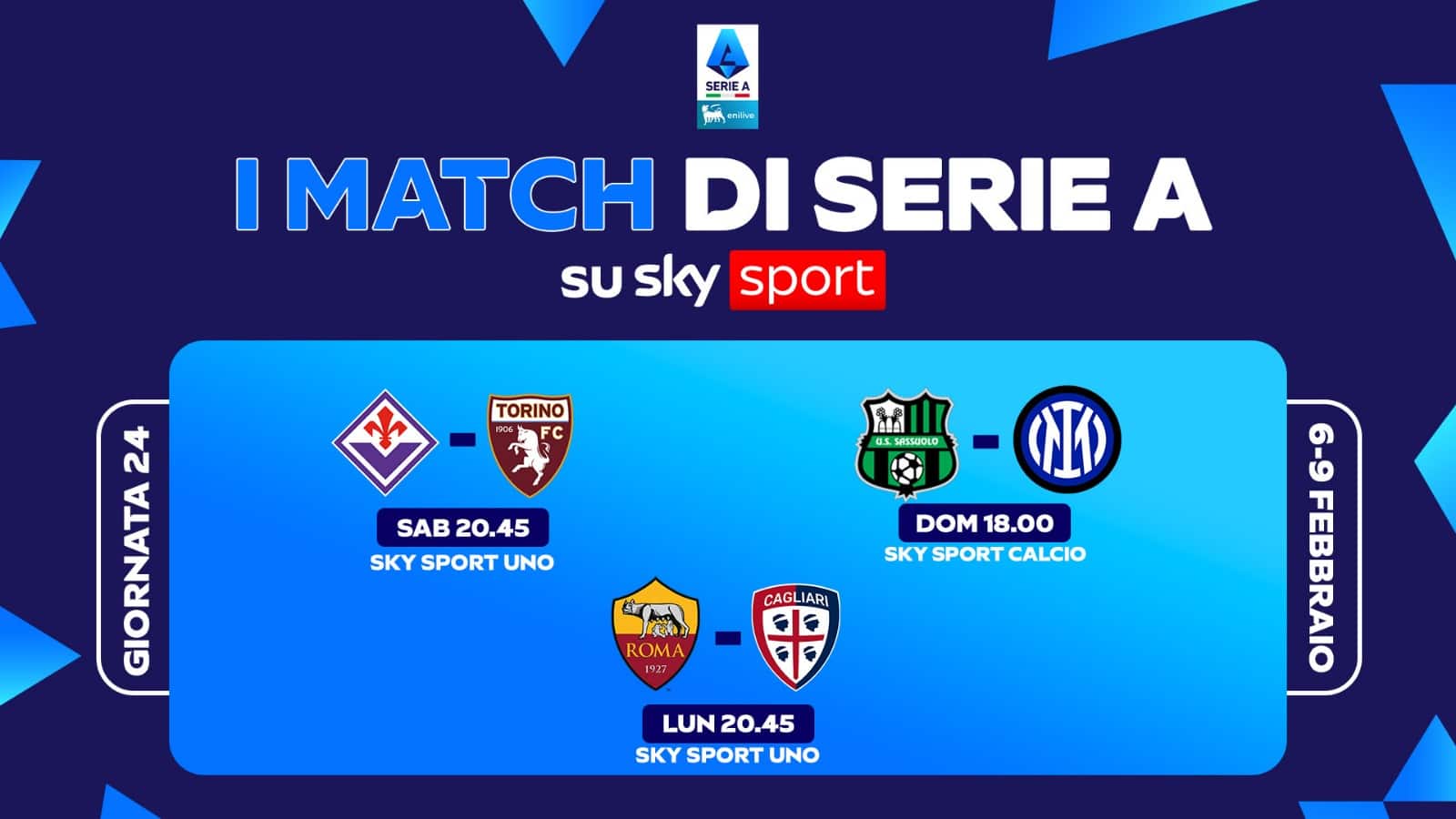 Il ventiquattresimo turno di Serie A della stagione si gioca da venerdì 6 a lunedì 9 febbraio. Le 3 partite in diretta su Sky e in streaming su NOW saranno: Fiorentina-Torino, Sassuolo-Inter e Roma-Cagliari. Il fine settimana di Serie A che si apre venerdì 6 febbraio alle 20.45 con Verona-Pisa. Due gli appuntamenti del sabato: alle 18.00 con Genoa-Napoli e alle 20.45 Fiorentina-Torino su Sky Sport Calcio, Sky Sport Uno, Sky Sport 251 e in streaming su NOW. La domenica di campionato si apre alle 12.30 con Bologna-Parma e prosegue alle 15.00 con Lecce-Udinese. Alle 18.00 è il momento di Sassuolo-Inter su Sky Sport Calcio, Sky Sport 4K, Sky Sport 251 e in streaming su NOW, mentre alle 20.45 scenderanno in campo Juventus e Lazio. La giornata si conclude lunedì 9 febbraio. Alle 18.00 Atalanta-Cremonese e alle 20.45, con Roma-Cagliari su Sky Sport Uno, Sky Sport Calcio, Sky Sport 4K, Sky Sport 251 e in streaming su NOW.