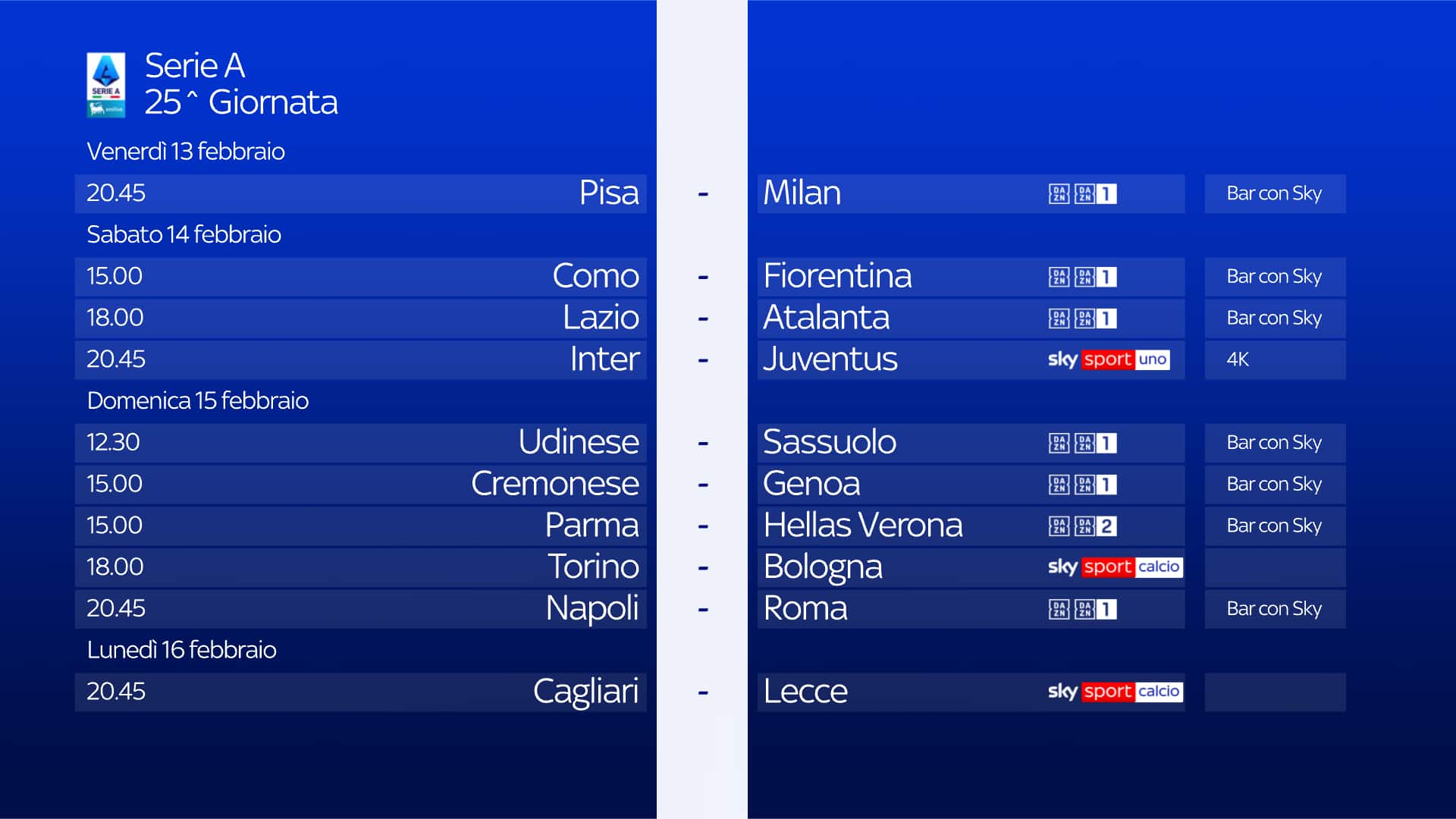 guida tvLa partita tra Pisa e Milan della 25^ giornata di Serie A si gioca venerdì 13 febbraio alle 20.45 e sarà in diretta sulla app di DAZN e sul canale DAZN, disponibile al canale 214 del telecomando Sky