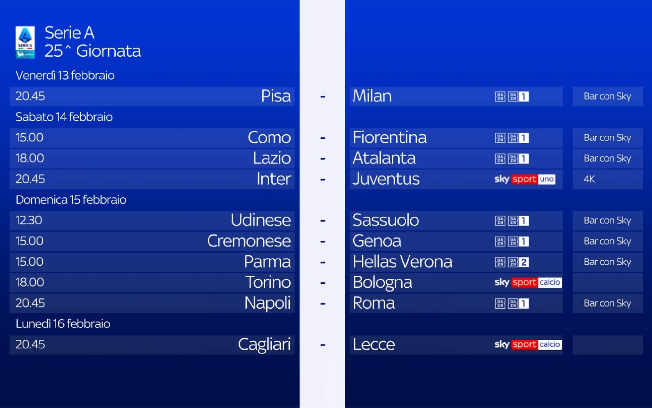 Le partite di Serie A di oggi, il calendario e gli orari della 25^ giornata