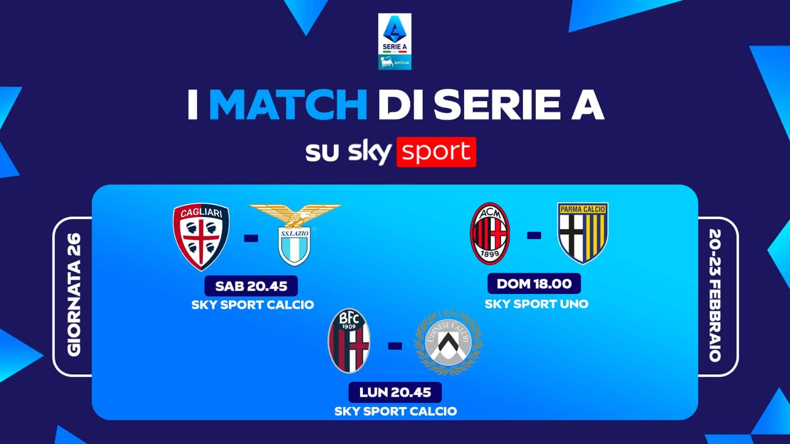 guida tvLa partita Cagliari-Lazio della 26^ giornata di Serie A, si gioca sabato 21 febbraio alle ore 20.45 e sarà in diretta su Sky Sport Calcio, Sky Sport 251, Sky Sport 4K e in streaming su NOW