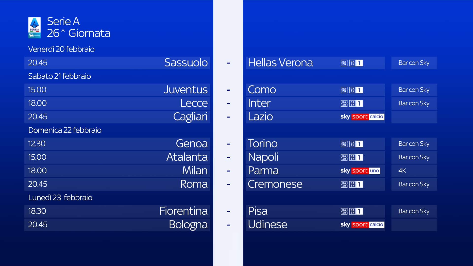 La partita Bologna-Udinese, valida per la 26^ giornata di Serie A sarà trasmessa lunedì 23 febbraio alle ore 20.45 e sarà in diretta su Sky Sport Calcio, Sky Sport 251 e in streaming su NOW. Telecronaca Antonio Nucera, commento Giancarlo Marocchi; inviati Marco Nosotti e Marina Presello. Appuntamento con l'Originale dalle ore 20 alle 20.35 e dalle 22.45 a mezzanotte: in studio Alessandro Bonan in compagnia di Veronica Baldaccini, Gianfranco Teotino, Luca Gotti, Riccardo Montolivo e Gianluca Di Marzio.