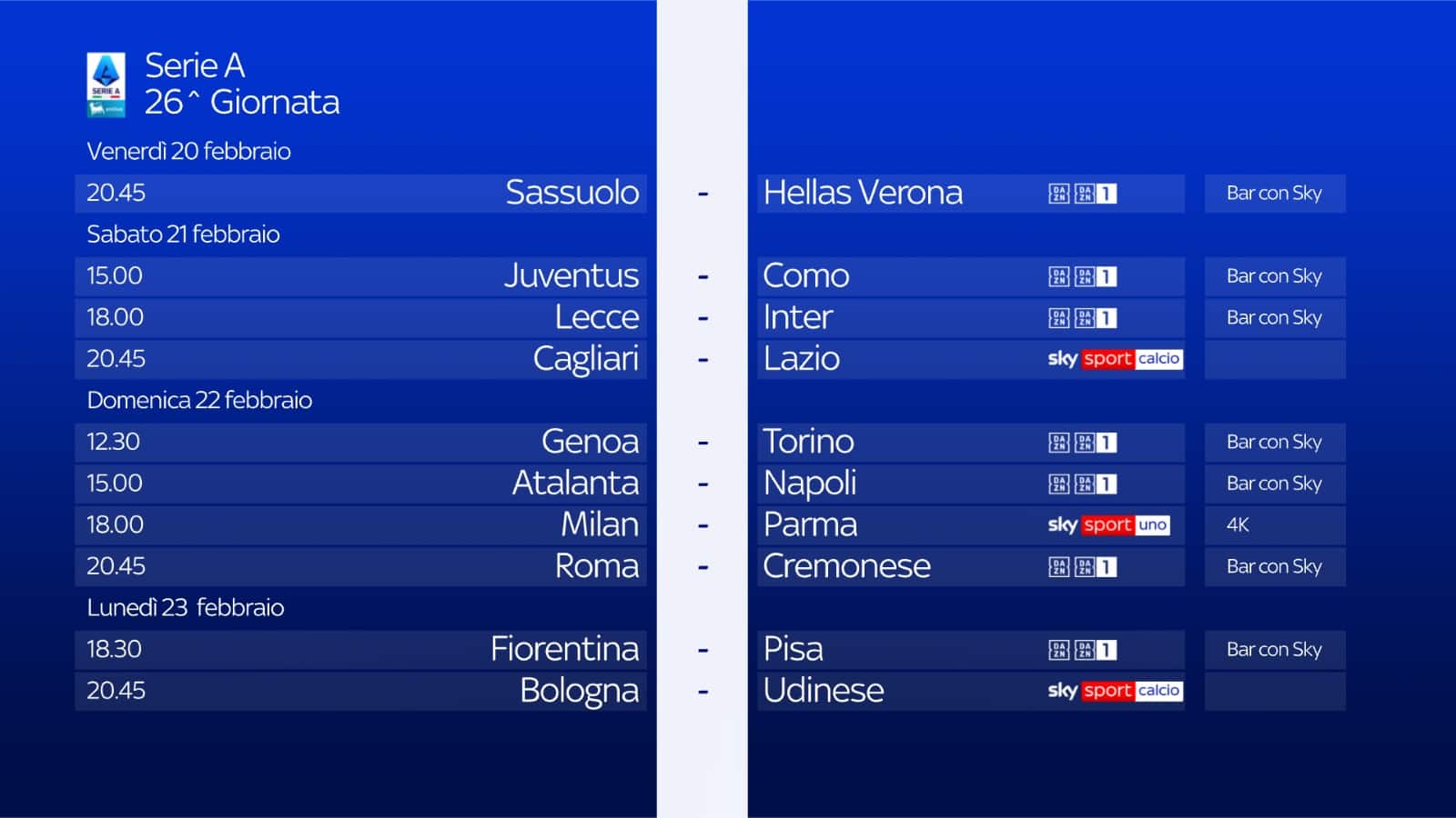 La 26^ giornata di Serie A si conclude lunedì 23 febbraio con alle 18.30 Fiorentina-Pisa e alle 20.45 con Bologna-Udinese su Sky Sport Uno, Sky Sport 251 e in streaming su NOW. Telecronaca di Antonio Nucera con il commento di Giancarlo Marocchi. Inviati Marco Nosotti e Marina Presello.