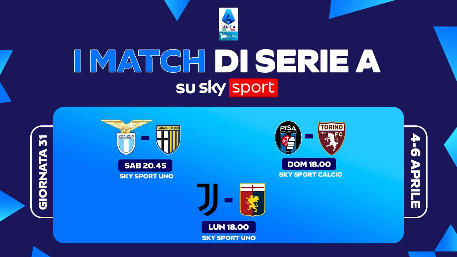 Il trentunesimo turno di Serie A della stagione si gioca da sabato 4 a lunedì 6 aprile. Le 3 partite in diretta su Sky e in streaming su NOW saranno: Lazio-Parma, Pisa-Torino e Juventus-Genoa. La giornata di Serie A si apre sabato 4 aprile alle 15.00 con Sassuolo-Cagliari e prosegue alle 18.00 con Verona-Fiorentina. La sera, alle 20.45, è il momento di Lazio-Parma su Sky Sport Calcio, Sky Sport Uno, Sky Sport 4K, Sky Sport 251 e in streaming su NOW. Sono tre gli appuntamenti della domenica di campionato che si apre alle 15.00 con Cremonese-Bologna, prosegue alle 18.00 con Pisa-Torino su Sky Sport Calcio, Sky Sport 251 e in streaming su NOW, mentre alle 20.45 è il momento di Inter-Roma. Il lunedì di Pasquetta si inizia alle 12.30 con Udinese-Como, alle 15.00 Lecce-Atalanta e alle 18.00 Juventus-Genoa su Sky Sport Calcio, Sky Sport Uno, Sky Sport 4K, Sky Sport 251 e in streaming su NOW. La giornata di campionato si conclude il lunedì sera alle 20.45 con Napoli-Milan.