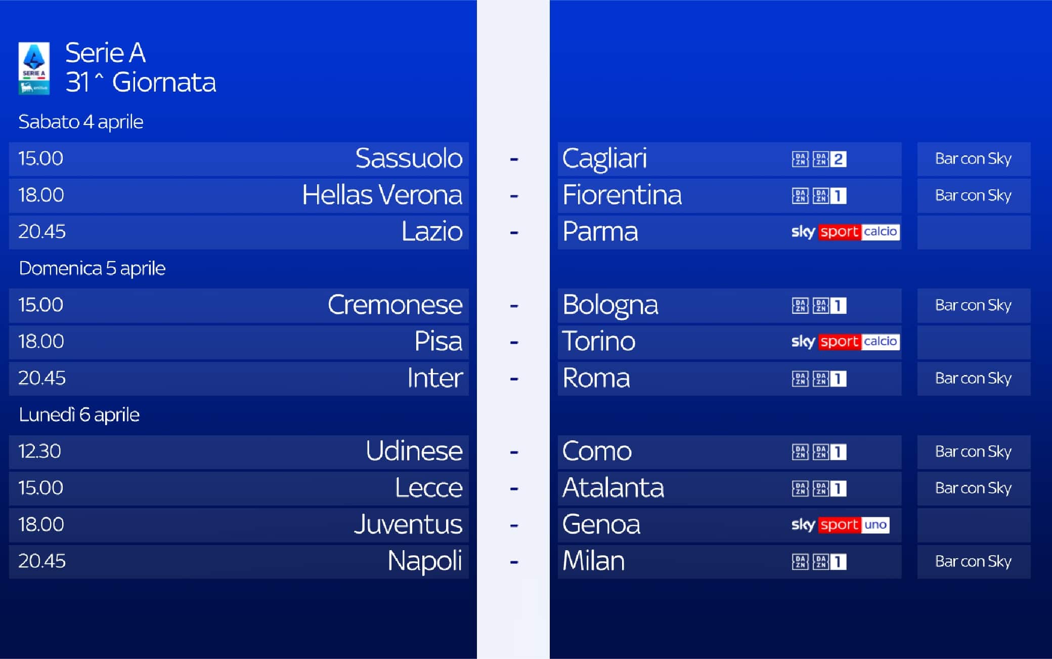 guida tvOggi, domenica 5 aprile, scendono in campo Pisa e Torino per la 31^ giornata di Serie A. Alle 18.00 Pisa-Torino su Sky Sport Calcio, Sky Sport 251 e in streaming su NOW