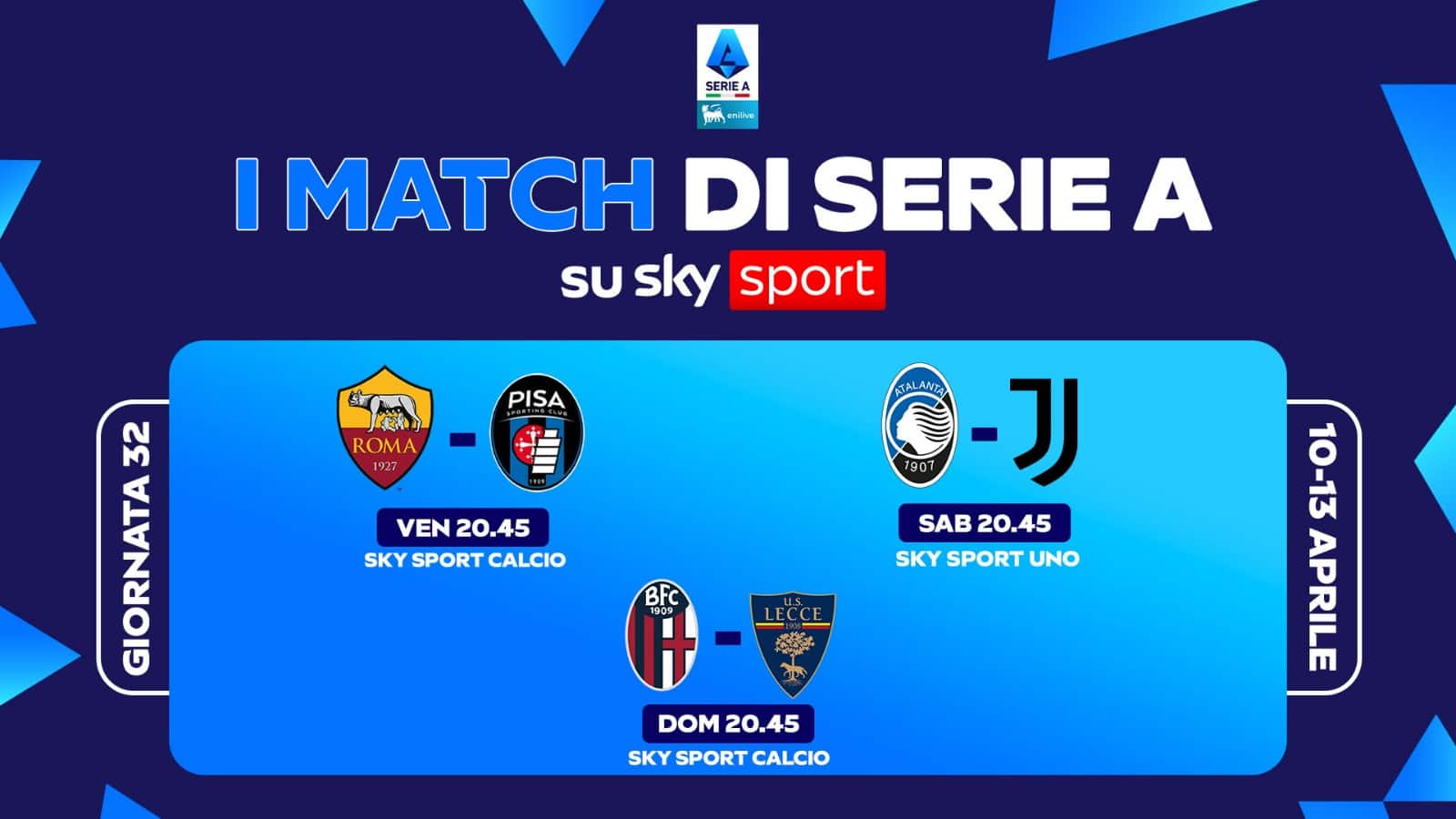 Il trentaduesimo turno di Serie A della stagione si gioca da venerdì 10 a lunedì 13 aprile. Le 3 partite in diretta su Sky e in streaming su NOW saranno: Roma-Pisa, Atalanta-Juventus e Bologna-Lecce. La giornata di campionato si apre venerdì 10 aprile alle 20.45 con Roma-Pisa, in diretta su Sky Sport Calcio, Sky Sport 4K, Sky Sport 251 e in streaming su NOW. Sono quattro gli appuntamenti del sabato che inizia con due partite alle 15.00: Cagliari-Cremonese e Torino-Verona. Si prosegue alle 18.00 con Milan-Udinese. La sera, alle 20.45, è il momento di Atalanta-Juventus in diretta su Sky Sport Calcio, Sky Sport Uno, Sky Sport 4K, Sky Sport 251 e in streaming su NOW. La domenica di campionato si apre alle 12.30 con Genoa-Sassuolo, prosegue alle 15.00 con Parma-Napoli, mentre alle 18.00 è il momento di Bologna-Lecce su Sky Sport Calcio, Sky Sport 251 e in streaming su NOW. Alle 20.45 scendono in campo Como e Inter. Il lunedì si conclude la giornata di campionato con, alle 20.45, Fiorentina-Lazio.