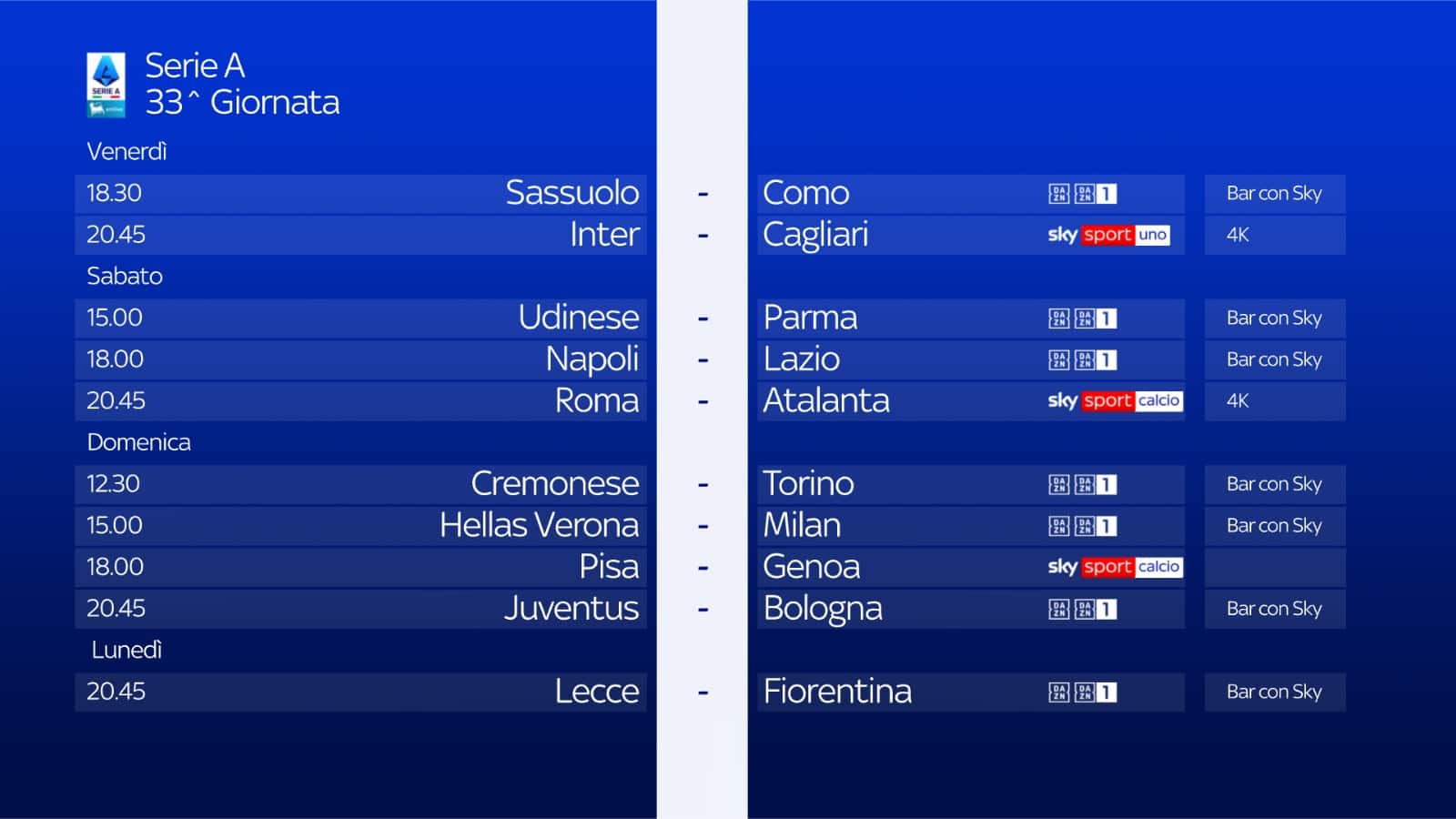 guida tvDa venerdì 17 a lunedì 20 aprile la 33^ giornata di Serie A su Sky e in streaming su NOW con 3 gare in co-esclusiva: Inter-Cagliari, Roma-Atalanta e Pisa-Genoa. Domenica sera ospite speciale a Sky Calcio Club: Vincenzo Montella. Aggiornamenti live su Sky Sport 24, SkySport.it e i canali social di Sky Sport, con i live blog, video, podcast e gli Skylights di tutti i match