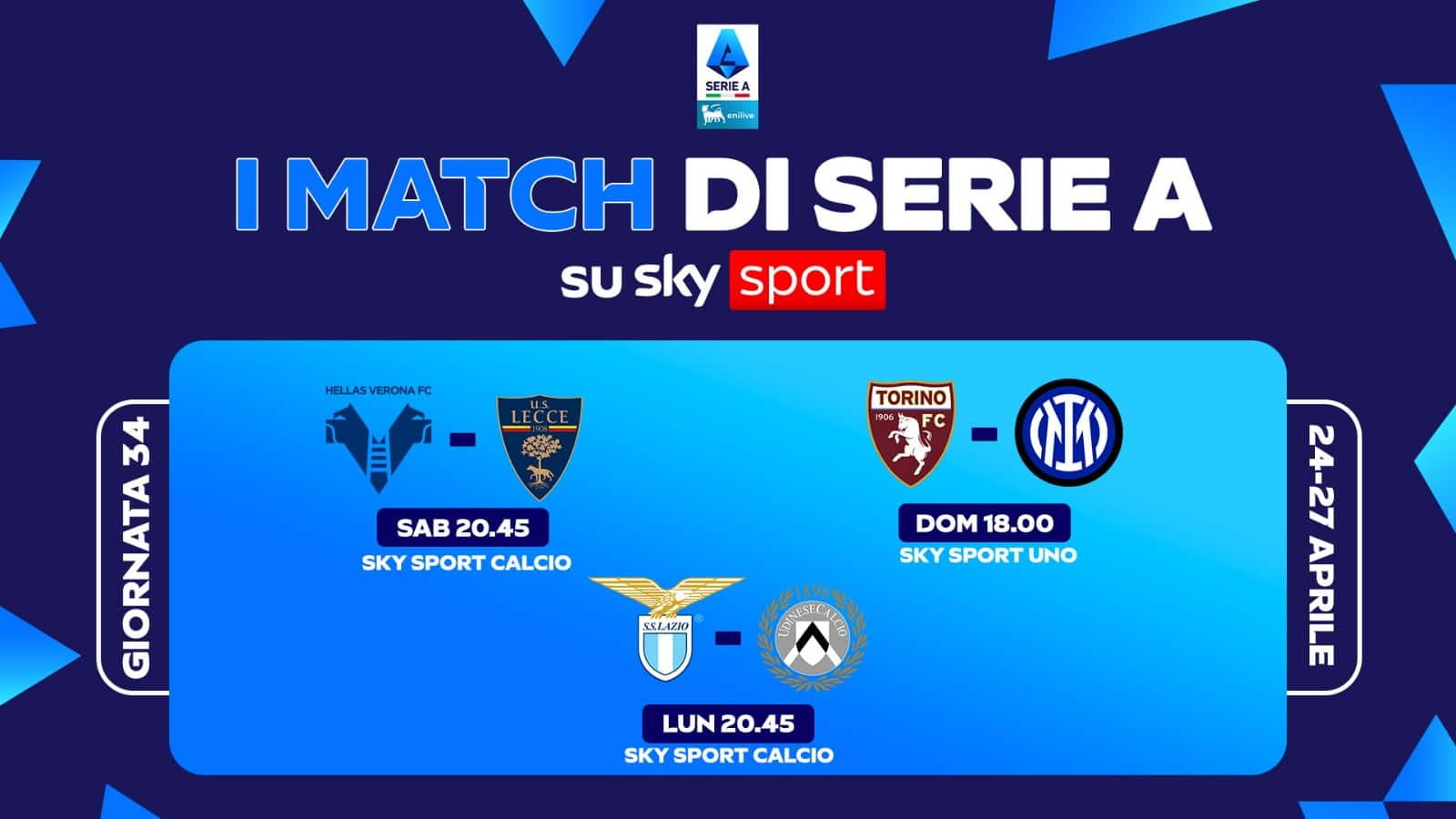 Il trentaquattresimo turno di Serie A della stagione si gioca da venerdì 24 a lunedì 27 aprile. Le 3 partite in diretta su Sky e in streaming su NOW saranno: Verona-Lecce, Torino-Inter e Lazio-Udinese. La giornata di Serie A si apre venerdì 24 aprile alle 20.45 con Napoli-Cremonese. Sono tre gli appuntamenti del sabato che inizia con, alle 15.00, Parma-Pisa. A seguire alle 18.00 con Bologna-Roma e la sera, alle 20.45, Verona-Lecce su Sky Sport Calcio, Sky Sport 251 e in streaming su NOW. La domenica di campionato si apre alle 12.30 con Fiorentina-Sassuolo, prosegue alle 15.00 con Genoa-Como, mentre alle 18.00 è il momento di Torino-Inter su Sky Sport Calcio, Sky Sport Uno, Sky Sport 4K, Sky Sport 251 e in streaming su NOW. Alle 20.45 scendono in campo Milan e Juventus. Il lunedì si conclude la giornata di campionato con, alle 18.30, Cagliari-Atalanta e alle 20.45, Lazio-Udinese su Sky Sport Calcio, Sky Sport 4K, Sky Sport 251 e in streaming su NOW.