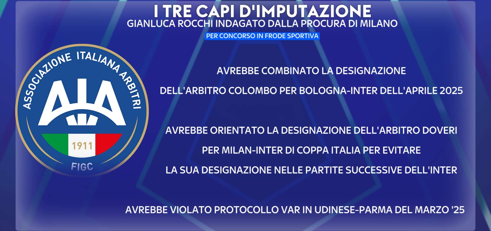 - In uno si legge che Rocchi "quale designatore arbitrale dell'AIA, in concorso con più persone presso lo stadio San Siro, durante la gara di Coppa Italia 'combinava' la designazione del direttore di gara per la partita di campionato di serie A Bologna-Inter (20 aprile 2025) nella persona di Andrea Colombo, siccome 'arbitro' gradito alla squadra ospite, l'Inter, impegnata nella lotta alla corsa scudetto, ormai alle battute finali della stagione calcistica".