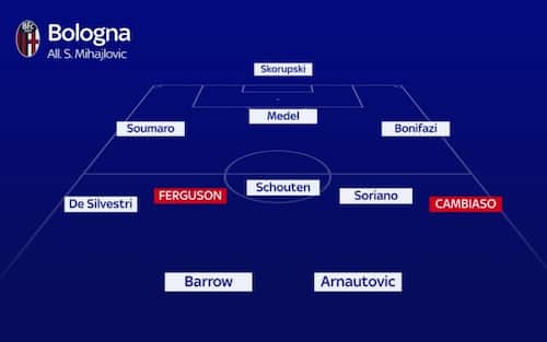 - BOLOGNA (3-5-2): Skorupski; Soumaro, Medel, Bonifazi; De Silvestri, Ferguson, Schouten, Soriano, Cambiaso; Barrow, Arnautovic. All.: Mihajlovic
