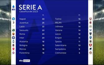 E' l'Inter la squadra regina del 2023. La formazione di Inzaghi non solo è in testa alla classifica del campionato ma è anche in vetta alla graduatoria dell'anno solare. Nonostante le difficoltà di questa stagione, il Napoli è secondo davanti a Juventus e Milan. Bel balzo della Fiorentina che precede Atalanta e Roma. Ecco tutti i numeri, squadra per squadra, dell'anno che si è chiuso