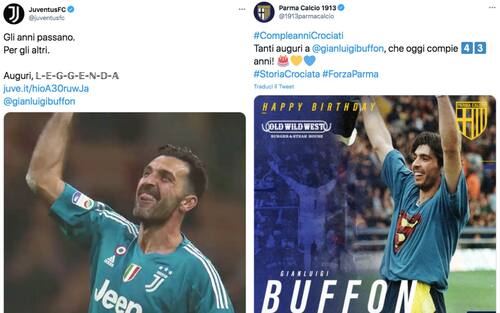 JUVE E PARMA - "Gli anni passano. Per gli altri" è il messaggio dei bianconeri. Mentre il Parma, con cui Buffon esordì in A nel 1995, ha scelto una foto di un giovane Gigi.