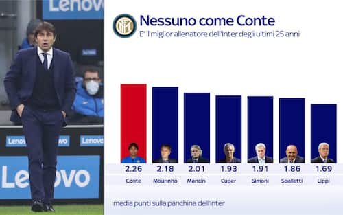 Numeri da record per Antonio Conte che, considerando la media-punti a partita, è al primo posto nella classifica dei migliori allenatori della storia dell'Inter negli ultimi 25 anni, ora anche davanti al vecchio "nemico" Mourinho. E nel confronto con l'intera carriera, quella attuale è una delle migliori stagioni di sempre