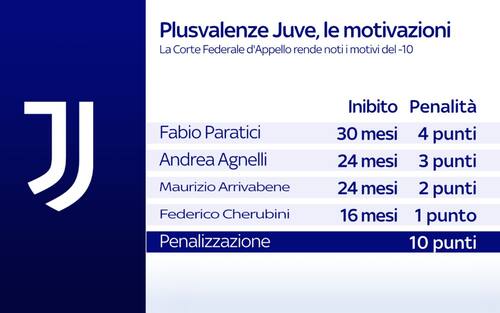 - "La sanzione di 10 punti da scontare nella stagione sportiva in corso, anche in un'ottica equitativa, si rivela del tutto idonea a soddisfare i criteri di afflittività, proporzionalità e ragionevolezza come innanzi enunciati". Queste le motivazioni della Corte federale d'appello sul caso plusvalenze. Penalizzazione commisurata alle responsabilità dei dirigenti: Paratici 4 punti, Agnelli 3, Arrivabene 2, Cherubini 1. Il proscioglimento degli altri membri del Cda è valso lo “sconto” di 5 punti rispetto al -15