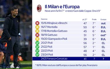 Quando mancano 11 giornate alla fine del campionato, il Milan è fuori dall’Europa. La riflessione sul futuro dunque non è solo tecnica, ma a 360 gradi, visto quel che comporterebbe per il club non disputare le coppe. I rossoneri non restano fuori dall’Europa da 10 anni (era la stagione 2016/16 con Mihajlovic e poi Brocchi in panchina, 7° posto finale in classifica; diverso il caso del 2018/19 quando l'esclusione fu dettata da ragioni legate al fair play finanziario, dopo il 5° posto in classifica)