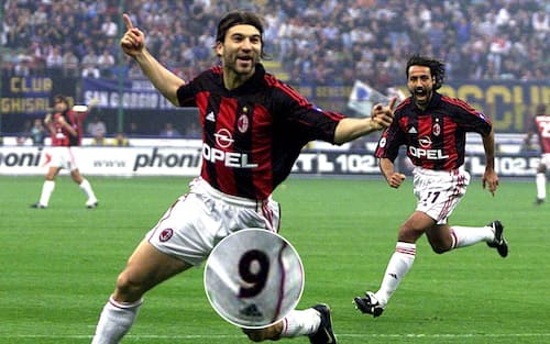 - 9 soltanto per una stagione, quella 2000-01, ereditando la maglia di Weah. Un 9 in gol soltanto in una partita di quel campionato… ma era il derby, quello che il Milan vinse 6-0. Suoi i primi due centri: resteranno addirittura gli unici in tutto il suo campionato, come era accaduto a Paolo Rossi (solo due gol, una doppietta nel derby) nel 1985, anche se Pablito li fece col 10 sulla schiena.