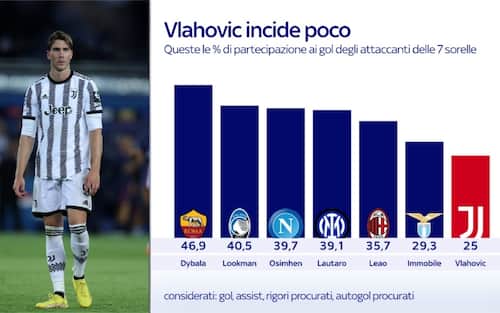 - Considerati i gol, gli assist, i rigori procurati e gli autogol procurati, il serbo della Juventus ha la percentuale di partecipazione più bassa ai gol rispetto a tutti gli altri concorrenti