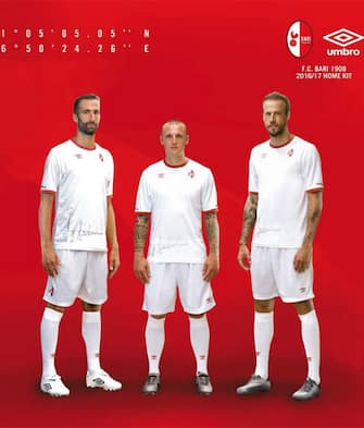 BARI. Anche i pugliesi del nuovo proprietario Giancaspro si specchiano nel passato: accolto il nuovo sponsor tecnico (Umbro), la maglia casalinga torna bianca con il rosso (colore predominante negli ultimi anni) a decorare solo i bordi. Il rosso tinge piuttosto la seconda divisa che diventa blu nella terza opzione -