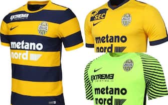HELLAS VERONA. Gli ambiziosi veneti di Pecchia sposano il progetto Nike e varano le righe orizzontali gialloblù, novità che vanta un precedente storico (stagione 1931/32) sebbene allora le strisce erano molto più strette. Nella maglia da trasferta è invece il giallo il colore dominante rifinito nel colletto e nelle maniche. Il portiere vestirà una divisa verde fluo -