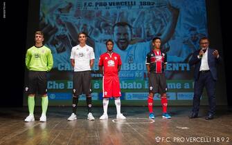 PRO VERCELLI. Orgoglio e tradizione nell’abbigliamento dei piemontesi di Moreno Longo, nuovo tecnico della Pro. La versione casalinga è composta dalla classica maglia bianca accompagnata da calzettoni dallo stesso colore e da pantaloncini neri. Rossa con bordi bianconeri la seconda divisa, nera invece la terza opzione -