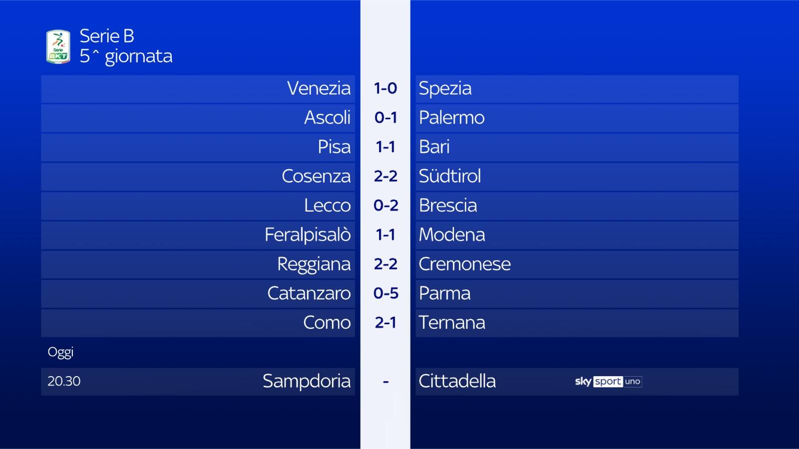 Si chiude stasera il 5° turno della Serie B, con il posticipo di Marassi tra la Sampdoria di Andrea Pirlo e il Cittadella. Il match alle 20.30 in diretta su Sky Sport Uno e in streaming su NOW