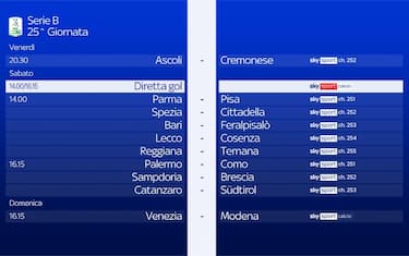 Torna in campo la Serie B per le gare della venticinquesima giornata di campionato. Si parte con l'anticipo di oggi alle 20.30 tra Ascoli e Cremonese. Si chiude domenica con il posticipo Venezia-Modena. Tutte le altre in campo sabato. Le partite in diretta su Sky Sport, "Diretta gol" e in streaming su NOW