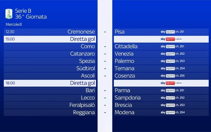 Torna in campo la Serie B per le gare della trentaseiesima giornata di campionato nel 'B-Day' del 1° maggio. Si parte alle 12.30 con Cremonese-Pisa. Poi alle 15 sono cinque le partite in programma. A seguire, alle 18, le restanti quattro. Le partite in diretta su Sky Sport, Diretta Gol e in streaming su NOW