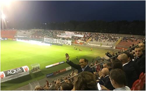 Berlusconi è poi salito in tribuna e ha salutato il pubblico che ha riservato un'ovazione al nuovo presidente (fonte foto Facebook Monza News) -