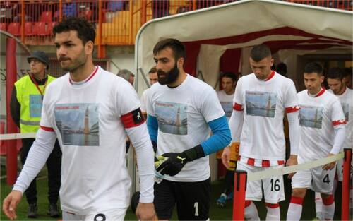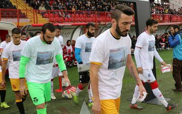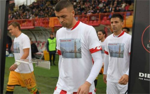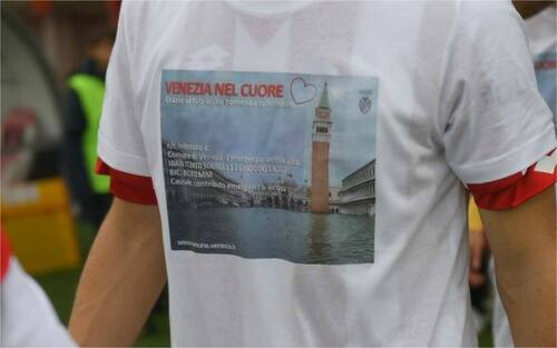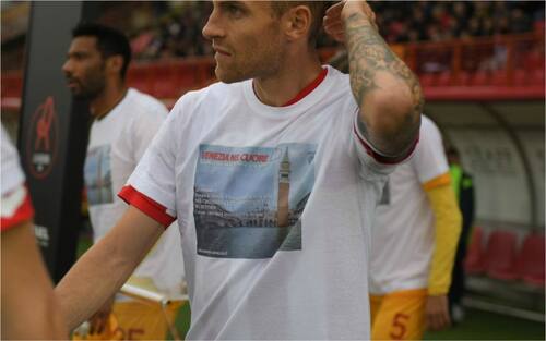 I calciatori di LR Vicenza e Ravenna sono scesi in campo indossando le speciali t-shirt in segno di solidarietà, in una campagna di sensibilizzazione, promossa dalla città di Venezia nelle ore successive allo stato di emergenza. (foto Facebook LR Vicenza)