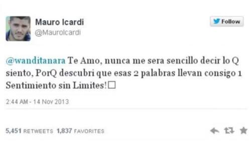 - La storia d'amore tra Mauro e Wanda nasce ufficialmente nel novembre del 2013, quando la showgirl era già in procinto di divorziare con Maxi Lopez. Icardi - che in estate era passato dalla Sampdoria all'Inter per 13 milioni di euro - si 'dichiara' su Twitter con un messaggio che non lascia dubbi: "Ti amo - scrive - non mi sarà mai facile dire quello che sento, perché ho scoperto che queste due parole portano con sé un sentimento senza limiti".