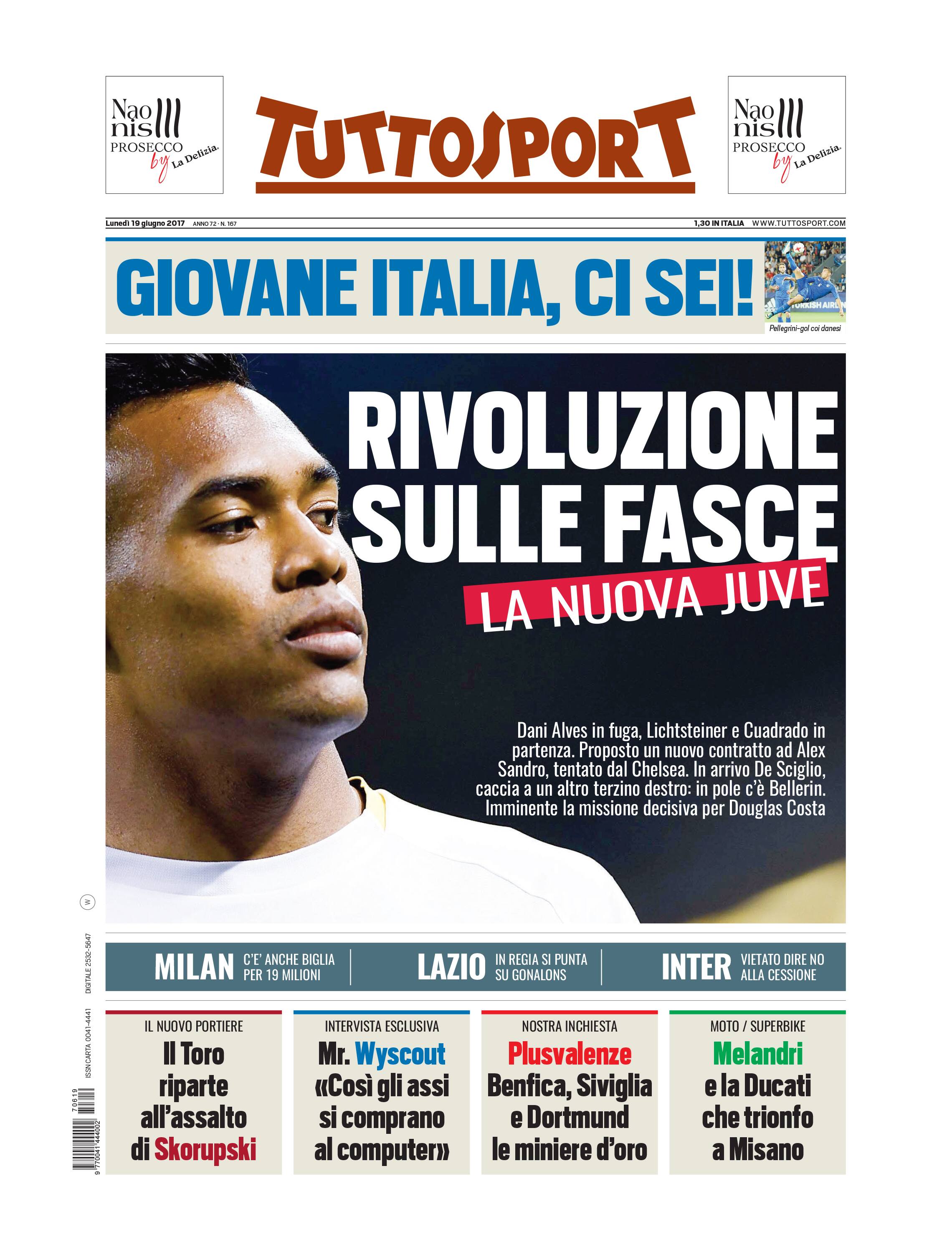 Sulla prima di TuttoSport, spazio al mercato della Juventus e a quella che il quotidiano chiama "Rivoluzione sulle fasce". "Dani Alves in fuga – si legge – Liechtsteiner e Cuadrado in partenza. Proposto un nuovo contratto ad Alex Sandro, tentato dal Chelsea. In arrivo De Sciglio, caccia a un altro terzino destro: in pole c’è Bellerin. Imminente la missione decisiva per Douglas Costa". Sul QS, invece, si parla di una "Juve in ansia per Dybala" e "Intanto Schick sta per firmare". Anche su La Gazzetta dello Sport si parla di "Dani Alves verso il City, la Juventus all’assalto di De Sciglio".