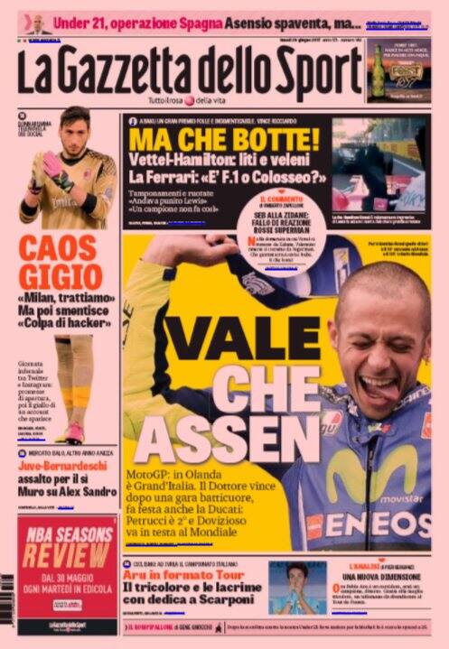 Un’altra pagina, ricca di colpi di scena, dell’estate di Gigio Donnarumma. Messaggi, rivelazioni e poi il clamoroso dietrofront, il tutto a causa (secondo la versione ufficiale) di un attacco hacker. Prima il tweet in difesa di Mino Raiola, poi il messaggio d’amore al Milan ed infine la precisazione: "Hackeraggio sul mio account. Chiudo social". Una spiegazione che lascia ancora qualche dubbio ma che arricchisce di un’altra pagina la storia di Gigio e del suo rapporto con i rossoneri. E proprio di questo, ovviamente, si parla in tutte le prime pagine dei quotidiani sportivi italiani. Nella parte destra, La Gazzetta dello Sport titola"Caos Gigio". "'Milan trattiamo'. Ma poi smentisce: 'Colpa di hacker', si legge. Anche il Corriere dello Sport dà spazio a Donnarumma e al suo messaggio: "Resto al Milan. Amore assoluto verso i rossoneri, sono pronto al rinnovo". "Messaggio di Gigio su Instagram dopo l'annuncio via Twitter di restare con Raiola. Il portiere vedrà i vertici del club con la sua famiglia e il procuratore dopo l'Europeo under 21", aggiunge il quotidiano. Tuttosport scrive: "Donnarumma: 'Pronto a discutere il rinnovo'".