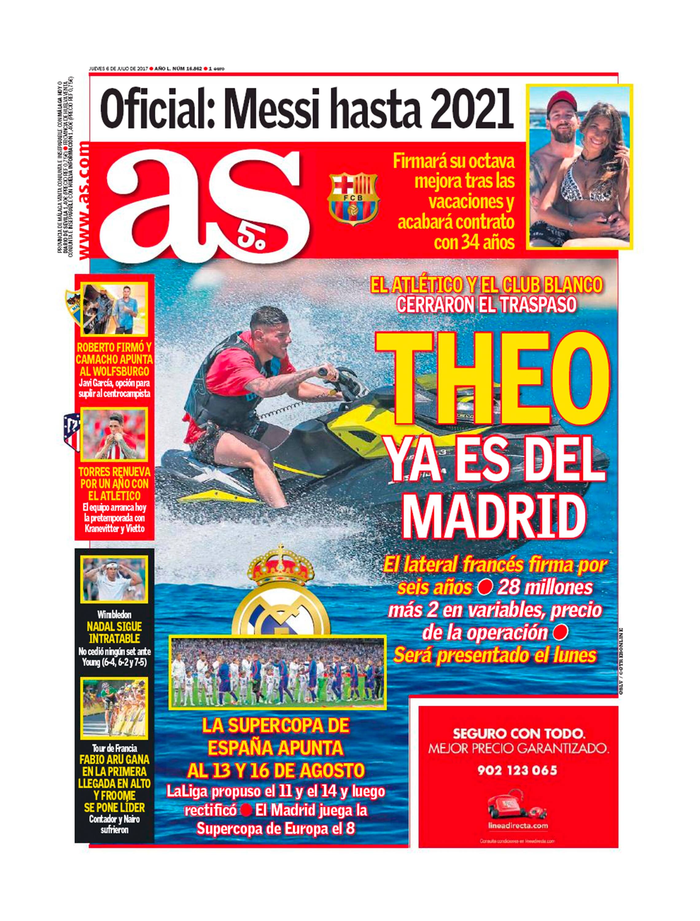 Il rinnovo di Leo Messi con il Barcellona e il passaggio di Theo Hernandez dall’Atletico al Real Madrid, operazione divenuta ufficiale nella giornata di ieri, sono questi i due argomenti principali trattati nelle prime pagine dei quotidiani sportivi spagnoli. "Messi 2021. E’ ufficiale: Leo rinnova con il Barcellona e rimarrà fedele all’unico club della sua vita, nel contratto clausola da 300 milioni di euro", scrive il Mundo Deportivo che dedica quasi per intero la prima pagina al fenomeno argentino. Rinnovo Messi che trova spazio anche su AS , che però dedica ampio spazio all’affare Theo Hernandez: "L’Atletico e il Real hanno chiuso il trasferimento. Theo è già del Real. Il laterale francese ha firmato per sei anni, 28 milioni di euro più due di parte variabile, queste le cifre dell’operazione. Sarà presentato lunedì 10 luglio".