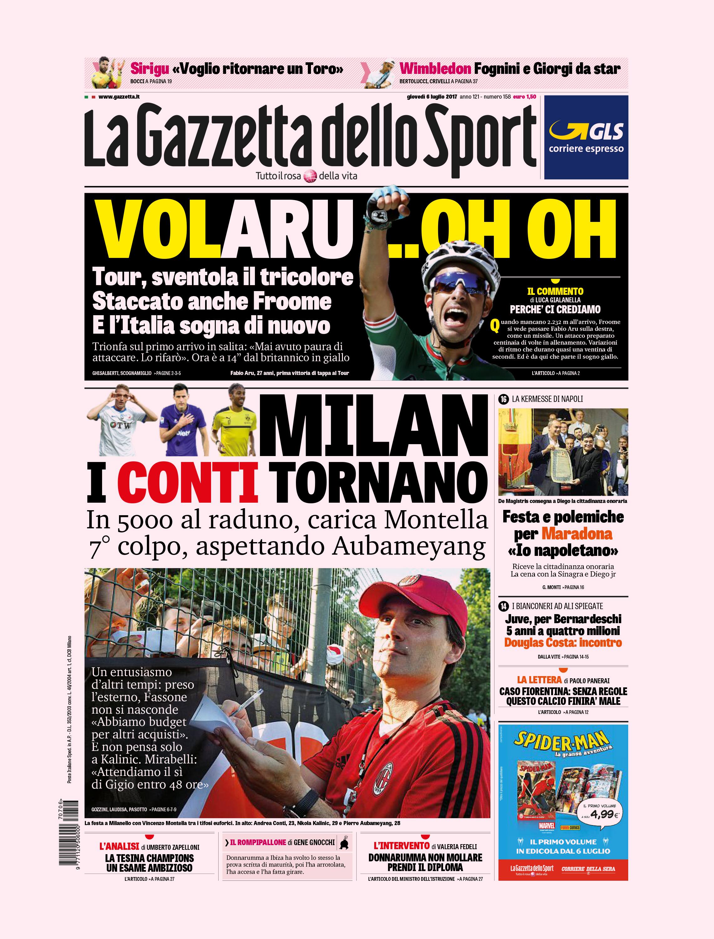 Tanto calciomercato nelle prime pagine dei quotidiani sportivi, con il Milan ancora protagonista: "I Conti tornano", scrive la Gazzetta dello Sport in riferimento all’acquisto dell’esterno dell’Atalanta. "La mia Juventus è solo all’inizio", le parole di Andrea Agnelli rilasciate in esclusiva a TuttoSport; bianconeri che non mollano Douglas Costa. Il Corriere dello Sport sul rinnovo di Messi: "39.4 milioni a stagione, il contratto più ricco della storia"